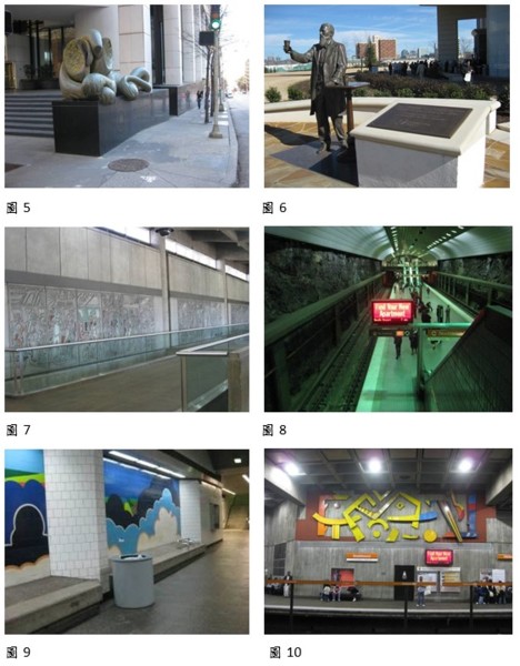 一到亞特蘭大機場,出了機門,經過候機室,迎頭便看到以喬治亞州棒球明星、爵士音樂明星、以及當地歷史照片(圖1、2),以及自然生物作為題材的公共藝術(圖3)。在市區,在枝椏間的雕塑(圖4)、街角旅館入口前的伏獅(圖5)、可口可樂總部前廣場的邀飲(圖6),以各種不同的姿態向行人打招呼。每個地鐵站,各有不同風格的設計(圖7,8,9,10),總令人期待下一站會是什麼。