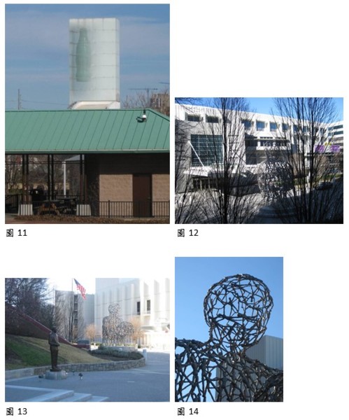 神奇的是,藝術家居然能夠不在電腦螢幕上演出「虛幻的真實」 (virtual reality的新解)。可口可樂大樓的巨大招牌(圖11)居然能夠不造成視覺衝擊,而又能讓人看到瓶子,的確高明!藝術中心的人頭公共藝術也是一絕!遠遠看,它是虛的(圖12,13),走近了才發現它是許多小人物手腳相連而成(圖14)。雖是小人物,卻是真實存在,正如我們每一個人。透過共同協力合作,可以形成虛體的(不是虛擬的)大腦智慧與創意!這件作品本身不但很有意思,更反映了藝術中心的場所精神。