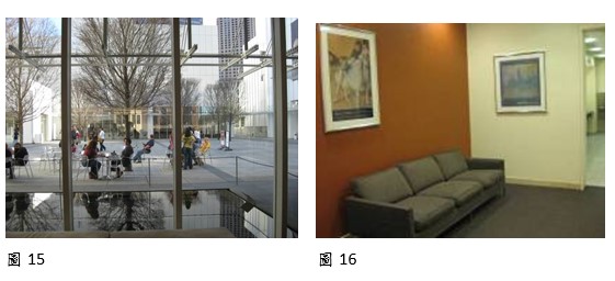 亞特蘭大藝術中心(Woodruff Arts Center)由音樂廳、美術館、博物館等好幾個藝術館舍所組成。它們並不是一次蓋成,而是在不同年代陸續出現的,但是建築風格十分協調。High Museum of Art是美國名建築師Richard Meier (http://en.wikipedia.org/wiki/Richard_Meier )的成名作。白色而幾何理性的建築物正是他的標準風格。乾乾淨淨的中庭,在冬末的枯枝陪襯下,午後陽光微溫中,坐在涼椅小桌旁聊天、看書、發呆,真是美事一樁!當然,像我走累了,坐在博物館內落地窗旁的沙發上,看著芸芸眾生,那是更舒服了(圖15)。如果想更安靜些,音樂廳的廁所門口,也有沙發,牆上掛著名畫(圖16,不必懷疑,右邊門進去便是洗手台),真是令人大開眼界。