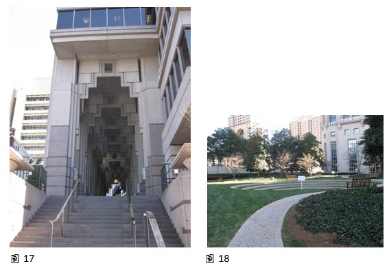 幾何直線是現代主義建築的特色,它是對於裝飾性極濃的巴洛克建築風格的反動!它為鋼筋混凝土以及玻璃等現代建材找到新的語彙,彰顯了驅動了工業革命的理性力量。像火柴盒的紐約聯合國大廈可說是典型之作。但是,火柴盒弄多了,高聳入雲的水泥森林,也開始令人煩厭。在藝術中心不遠處的這棟建築(圖17)為裝飾性的現代建築找到了一種新的可能!大樓之間的小綠地空間(圖18),草地、綠樹、長木椅、小徑、小廣場、陽光,可以讓匆匆的行人喘一口氣。