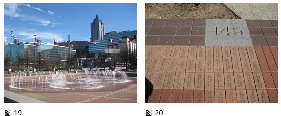 1996年亞特蘭大主辦第100屆奧運,並趁機開闢了奧運紀念公園。公園內有水池、定時音樂噴泉(圖19)、紀念柱,視野開闊,可環顧四週的CNN、可口可樂總部、水族館。只是步道上的磚塊刻上了人名,每一路段又有編號(圖20),令人納悶。詢之公園內的旅客中心,方知那是募款的方式之一,只要付一點小錢,便可以在磚塊上與奧運公園共同留名。哈!東方和西方的習俗果然不同!咱東方人那有名字擺地上任人踩的道理?洋鬼子果然心胸寬大,在教堂走道搶佔墓位不夠,如今公園步道上也來這麼一招。這也算是「文化的空間形式」的好教材吧!