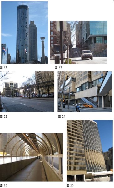 亞特蘭大的風很厲害,奧運公園東方的一棟圓柱形高樓幃幕玻璃,禁不起考驗,破了不少片(圖21)。亞特蘭大市中心的地也是很不平(圖22),在一個山丘上蓋起了樓房,可與舊金山一較高下。一樓大多為停車場。不過,亞特蘭大還是聰明些,乾脆弄個跨街廓的高架行人通道(圖23)。從旅館出來,拖著行李,在低的一端的公共停車場搭電梯,直上七樓。跨過整個街廓的停車場,一路走到另一端,成了二樓(圖24),連接室內的商場,再直下手扶電梯,即到地鐵。高架行人通道,本身內部很簡單,有採光罩,但兩側留空,以便通氣(圖25)。邊走邊看旁側的建築(圖26),不會覺得枯躁。