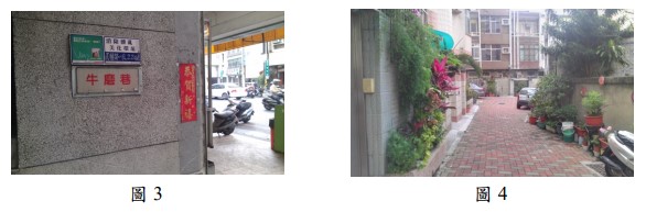 攤開現代的市街圖,寬粗的道路系統馬上映入眼簾,建構了我們對都市空間結構 的印象:棋盤式道路系統,間以數個圓環節點所構成的台南市。這些老巷道在當 今的地圖中,只會用最細的線條標示,甚至於省略不畫。不細心看,便會被忽略, 當做不存在。老巷道的名稱,在當今的地圖當中已經找不到;事實上,在現實世 界中也幾乎看不到,我只有在以前的「牛磨巷」巷口找標示著老路名的牌子(圖3)。 但是,老巷道們仍然存在於都市當中,只要稍微注意去找,便不難找到。 老巷道有一些特性:寬窄不一、蜿蜒曲折,相鄰各戶之間的牆面,不見得一致, 略有參差。有些巷道岔口甚至於形成小廣場。如今,老巷道裡的住家會用盆栽來 妝點空間(圖 4)。走在重舖的磚道上,偶爾出現「古意」盎然的老建築,十分愜意。 其實,有些建築其實還蠻現代的,只是荒廢了(圖 5, 6)。有些則透過「老屋欣力」, 找到了新生命。