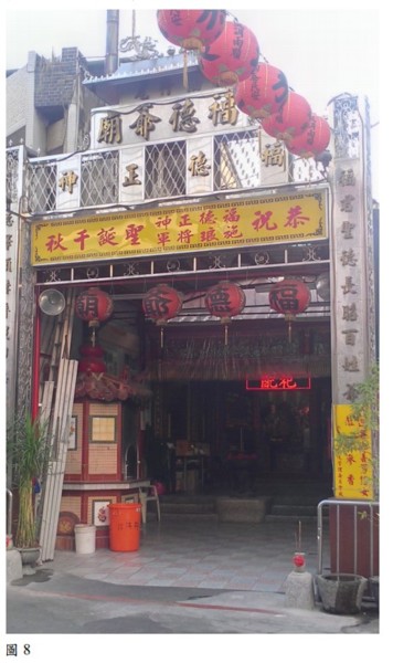 最有意思的是油行尾福德 爺廟,它同時祀奉著全台唯 一的施琅將軍神位。由於地 圖上從來不會標示土地公 廟,所以打從清代開始,一 直到現在,地圖上也從來沒 有出現過油行尾福德爺廟, 當然也看不出任何和施琅 有關的史蹟。只有到了現地, 在門楣上,才能在發現此一 關係(圖 8)。 鄭成功與施琅曾如手足,後來竟有殺父之仇。施琅率清軍滅了明鄭之後,獻祭於鄭成功之廟,曰:「自同安侯 (指鄭芝龍)入台,台地始有居民。逮賜姓(指鄭成功) 啟土,世為巖疆,莫可誰何。今琅賴天子之靈,將帥之力,克有茲土。不辭滅國之罪,所以忠朝廷而報父兄之職分也。但琅起卒伍,於賜姓有魚水之歡,中間微嫌,釀成大戾,琅於賜姓,剪為讎敵,情猶臣主。盧中窮士, 義所不為,公義私恩,如是而已。」如今,油行尾巷將施琅與鄭成功連在一起, 相距約 100 公尺,令人慨嘆!