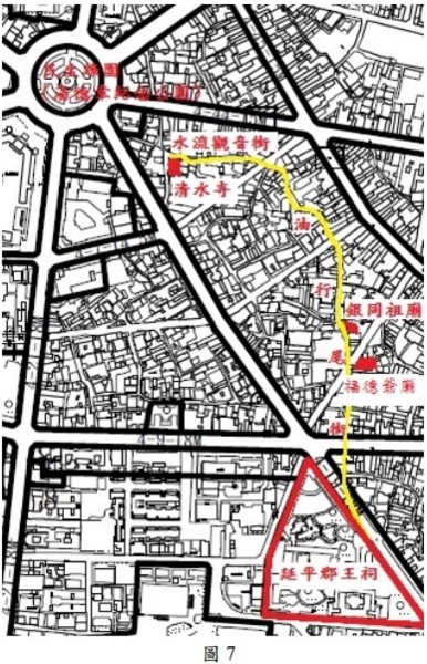 老巷道是有故事的。油行尾街(圖 7),在清代的城池圖裡即有。顧名思義,應該是 有許多油行的,如今已無。這條老巷道很長,串接了延平郡王祠、油行尾福德爺 廟、銀同祖廟,一直到民生綠園(湯德章紀念公園)附近的清水寺。