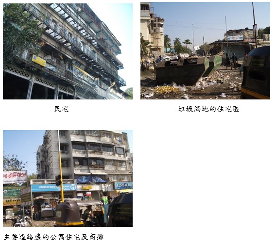 即使一般建築物也缺乏維修,十分破損髒污。詢之當地人士,始知印度為了照顧低收入戶,訂了租賃法,規定屋主除非有再投資改善,否則不得增加租金。結果,反而造成反效果。由於租金難以提高,屋主的維護意願極低,結果市容嚴重衰敗。孟買市郊的高級住宅區,以鐵柵圍住,有警衛駐守,具體的反映了貧富差距的嚴重性。