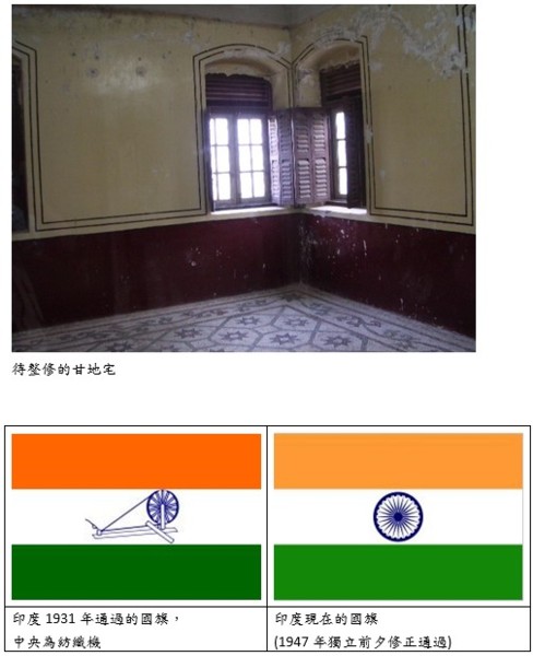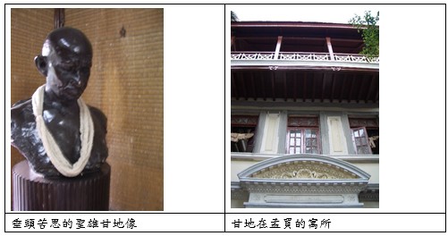 印度的國父--甘地並不是孟買人,但曾住過市區某間位在三樓的小房,許多革命大業在此聚會。目前改為博物館,以紙模型介紹甘地生平。中有二次大戰前甘地分寫給希特勒與羅斯福總統之信,勸希特勒以蒼生為念,停止發動戰爭。博物館中介紹了印度國旗的演變史。印度1931年的國旗中央原是紡織機(後來於1947年改成現在的24道法輪)。甘地曾號召人民燒毀外國進口布料,提倡民族手工業,以紡織機為代表。顯然,甘地是一位偉大的民族英雄,卻不是一位好的經濟學家!以今日觀之,印度六十年的努力竟不如鄧小平的二十年改革開放。可見資本主義力量之大!印度力圖避免成為資本主義的殖民地,這又是一條何等艱辛的路!