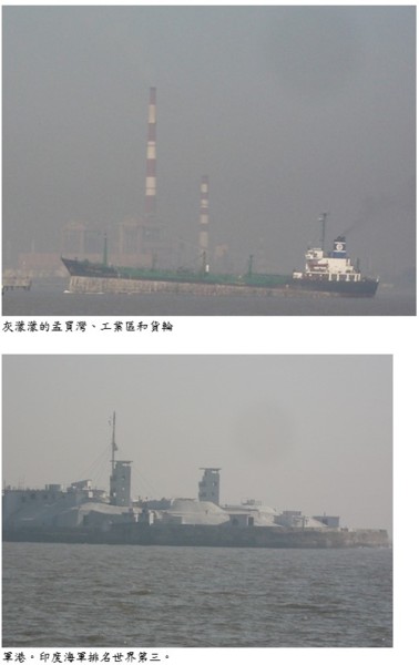 孟買灣內風平浪靜,確是良港,其腹地及水域規模遠非高雄、基隆可比,令人想起大陸的寧波港,也是具有如此優良的條件。孟買為印度第一港,灣內有數大島,做為碉堡,扼灣之咽喉。但是灣水混濁,諸島為薄霧所罩,復有工廠、小核能廠,港灣內泊有大貨船。