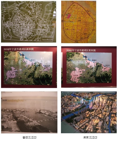 寧波市政建設館展出了一系列的古地圖,可以看出寧波的發展軌跡。它的發源地在三江口,春秋(公元前473年)越王勾踐在此築城。從圖上可看出,城池位於三江口西側,有護城河,城內亦有一大池。隨著歷史的推演,街道越來越密集,公共建物也越來越多。從1998年到2002年,城區朝南方繼續發展。三江口做為市中心的地位並不會改變,高樓化的趨勢將不可避免。如何讓新舊建物保持和諧發展,也將是寧波市必須面對的課題。