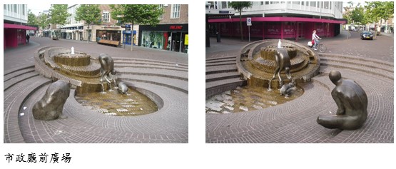 市政廣場前的水景,一隻熊看著正在水邊休憩的一家三口。市政廣場位於老市區的中心,有寬廣的街道,以行人徒步為,但是腳踏車、汽車也會進來。