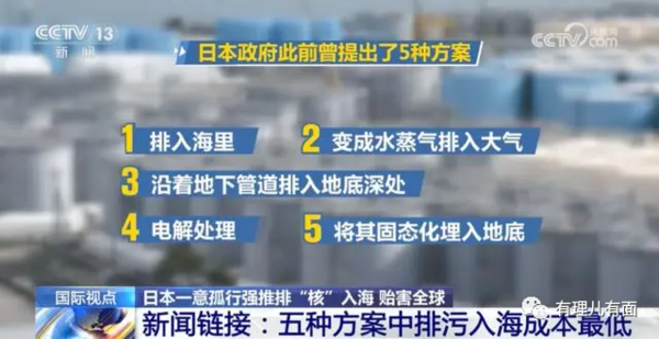 其三,切尔诺贝利和三哩岛核事故,其都是大气释放,到目前没有核事故处理后废水向海洋排放的先例。处理核废水并非仅有一条路,如沿着地下管道排入地底深处、变成水蒸气排入大气、电解处理,并可以“在陆地上继续建设大型贮罐”或“用灰浆凝固处理”。然而对日本政府而言,排海却是花费最少的选择。核污染水排入大海所需经费约为34亿日元、仅为水蒸气排放的十分之一。日本政府不愿意拿出更多的钱去妥善处理这一个问题,将核废水往大海“一倒了之”,倒是更“省钱、快捷”的选择。对他们而言,经济考量在安全考量之前。