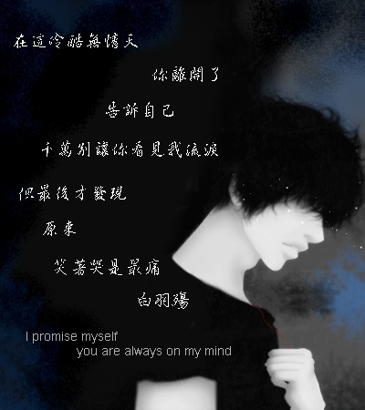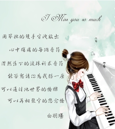 清脆動人的音符 簡單悅耳的聲音 舞動手指輕輕落下 隨著旋律加重力道 敲打這白色的鍵盤 手指接觸它的冰冷鍵 也如同我那冰凍的心 將對你思念的殤痛 用笨拙的雙手宣洩敲出 我心中殤痛的每個音符 眼中潸然落下...