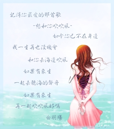 微涼的風 吹起柔順的髮絲 好久沒這樣吹吹風 記得你最愛的那首歌 「想和你吹吹風」 如今你已不在 我一生再也沒機會 沒機會和你吹吹風 偌大的窗戶 傳來樹葉和風譜出 動人安慰的音符 像是轉達你的聲音 ...