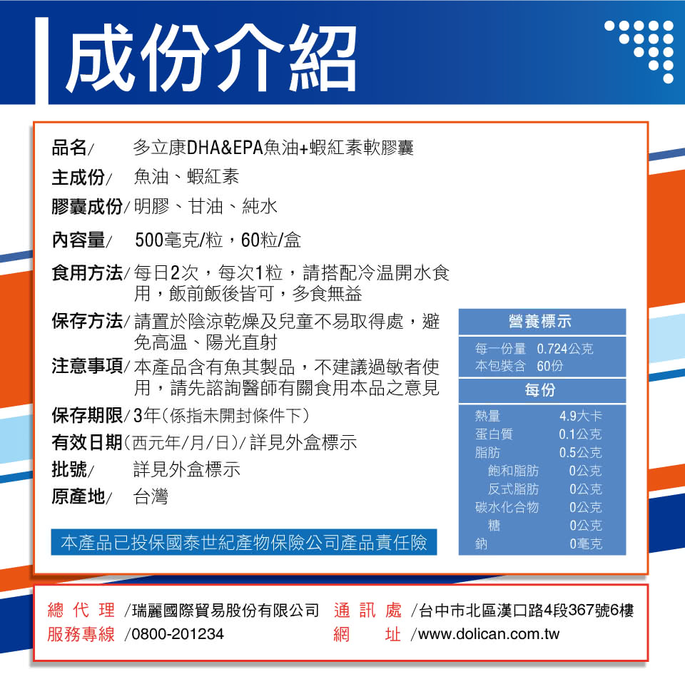- 1.商品組合/規格:【多立康】DHA&EPA魚油+蝦紅素軟膠囊(60粒/盒)