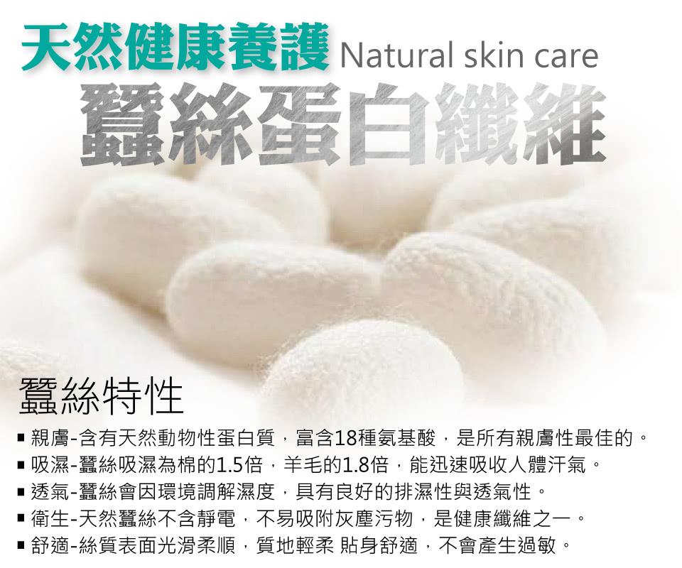 衛生-天然蠶絲不含靜電,不易吸附灰塵污物,是健康纖維之一。