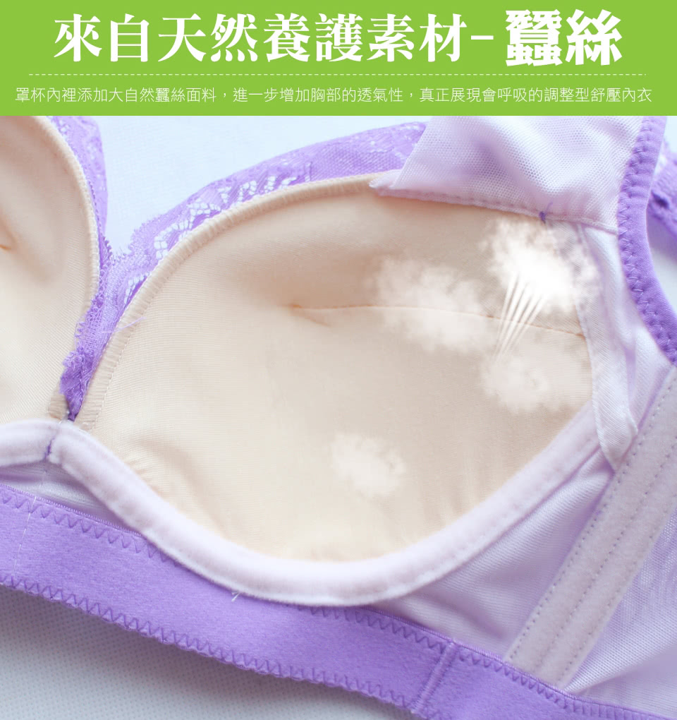 罩杯內裡添加大自然蠶絲面料,進一步增加胸部的透氣性,真正展現會呼吸的調整型舒壓內衣。