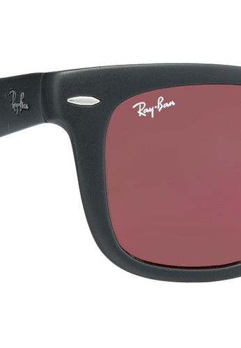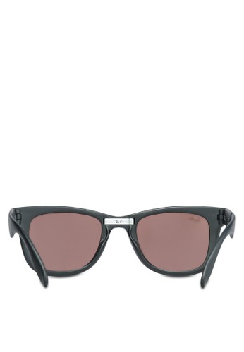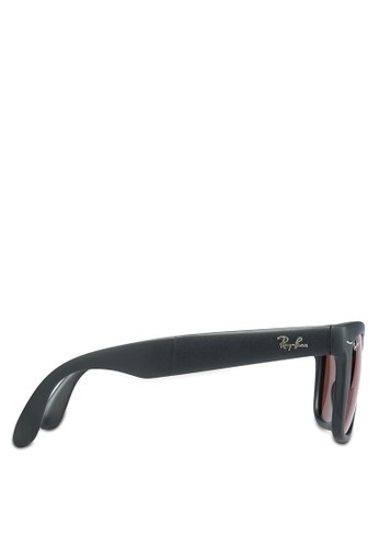 Ray-Ban 的Wayfarer 折疊式太陽眼鏡,磨砂質感黑色粗鏡框,搭配染色水晶鏡片,可折疊式設計方便隨身攜帶,時尚百搭。