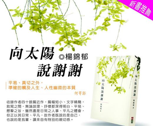 本書收錄楊錦郁女士四十餘篇近作,篇幅短小,文字精簡。敘寫之間,無論說理、抒懷都深得明白、平易、懇摯。雖然是日常之人事、平常之體會。但正以其之日常平凡,故作者既說是自己,也說是我輩,讀來自有特別的親切感。