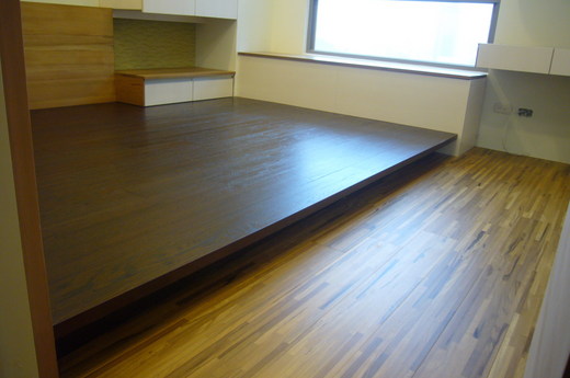設計師專案:全屋以頂級琥珀木指接厚皮300條海島型木地板,平鋪+架高施工