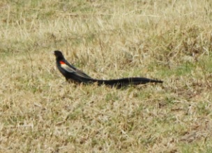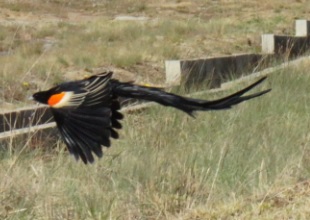 拿他自己的身體來做比例,尾巴居然比身體還長,牠叫長尾寡婦鳥,之前我拍的照片就一條黑黑的從天上畫過去。這回看到牠在草地上停留,看清楚翅膀外側還有漂亮的顏色。