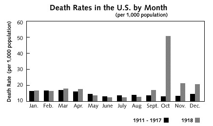 第二階段是在1918年秋天,看看下圖美國的統計圖就知道那年的十月有多慘。黑色的是1911~1917年的死亡率,灰色的是1918那年的死亡率,在春天1918年單一就有幾個月已經勝過那七年的總和,到了九月則更是將近兩倍,十月就請你自己去算是幾倍!