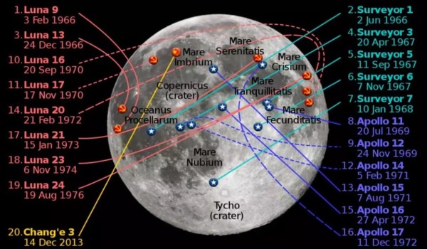 2013年的嫦娥三號則在月球面向地球這面的雨海(Mare Imbrium)旁邊之虹灣登陸,在月球表面巡查探勘,採集岩石樣本並進行分析,不過看看上圖,月球正面美蘇兩國已經很多探測器去過了,甚至還有12個美國人踏上月球表面,不只黑色平原有人去,連白色高山也去探勘過,這還是四、五十年的事情,因此若想有更大的突破,就得把眼光繞到月球背面去,那裏雖然有過幾張照片,但還沒有探測器降落過,這就是嫦娥四號的任務。