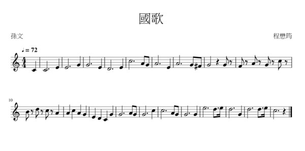 今天我又要輸入音樂,找那位年輕人過來。我翻翻本子,想找一首最簡單的給他,翻來翻去發現最簡單的就是國歌,可以嗎?他很高興,他說高中時,別班幾乎都不唱國歌,但他的導師因為是軍人退伍,對國歌很有感情,因此導師會鼓勵大家唱,他們班還會唱。我帶著他開新檔案、輸入歌名、作詞者、作曲者,還要選拍子,他告訴我一分鐘72拍很好,這首歌還是弱起拍子,我們在這方面交流了些音樂上的知識。