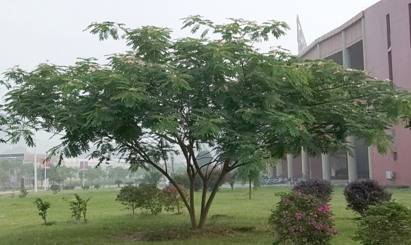 圖書館附近有棵跟鳳凰木很像,同為羽狀複葉的植物,看起來比一般我見過的鳳凰木還小,但那說不定是。用手機軟體掃一下,「合歡」。我記得幼年時候上學的路旁有棵銀合歡,如果它開了花,我經過的時候都會在那邊玩一玩。但合歡跟銀合歡像嗎?感覺以前看的銀合歡比較小,連當年幼小的我都可以湊近爬高看它的花,現在這棵這麼大!我還是期待它會是鳳凰木。