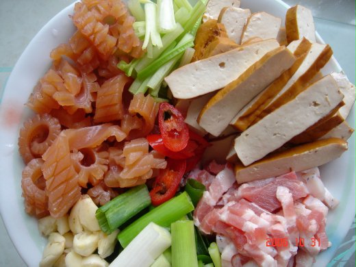 五花肉1斤(切 絲)、五香豆干4塊、芹菜段、