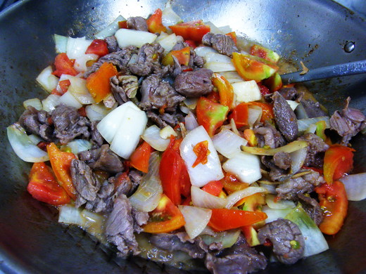 作 法:1.油鍋加熱放薑片、蒜頭、爆出香味後加入牛肉續炒