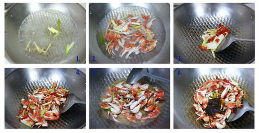 3.放入蒜頭、薑片、辣椒、葱段爆炒再放入蟹腳拌炒