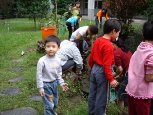 每個月的第二個禮拜天,我們都會到八里的天主教養老院去當義工,幫忙清掃住所、水塔或是週遭環境。這週輪到小朋友最喜歡的洗魚池,因為小朋友要負責先把魚撈起來,我們等水抽快乾了再開始刷池邊的青苔。