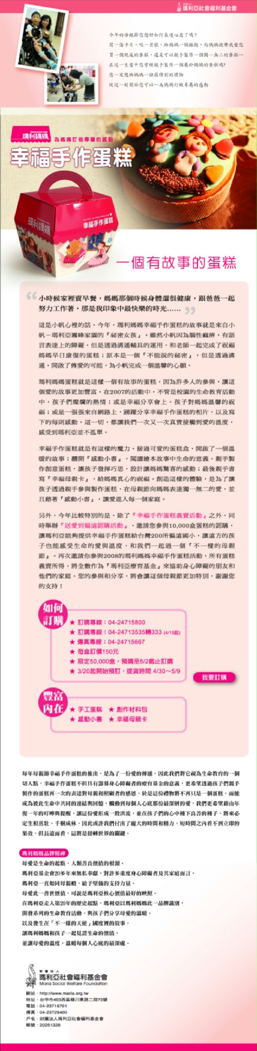 2008年母親節,瑪利亞基金會附設瑪利媽媽蛋糕舖推出「幸福手作蛋糕」,要讓小朋友發揮創意完成自己親手特製的幸福蛋糕。 基金會特於4/29日舉辦一場『為媽媽訂做專屬的感動-千人手作蛋糕』大型活動,邀請台北市1000位小學生製作蛋糕,親手表達對媽媽獨一無二的愛。並邀請偶像明星楊丞琳為特別來賓,共同參與感動的盛會,並讓與會的學子一起關懷生命、分享愛心。