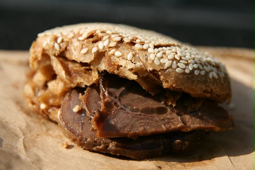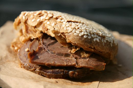 真的是好吃,首先它牛肉滷的很透很夠味肉質又嫩,再加上它的芝麻醬燒餅,可以看的出麵跟芝麻醬交疊,越咬越有味道,芝麻的香味會慢慢散發出來,光吃燒餅就很好吃了,不過再搭配上牛肉,真的是差點將舌頭都給吞下去了,所以兩個吃完後,阿德連忙下車再買了十個,自從電視介紹後,真的是不得了,不一會又開始排起隊來了,還好來的早,燒餅類本來就很容易口乾,店家也有賣酸梅湯,不過我個人就不愛了,總之呀又多知道了一個好地方了!
