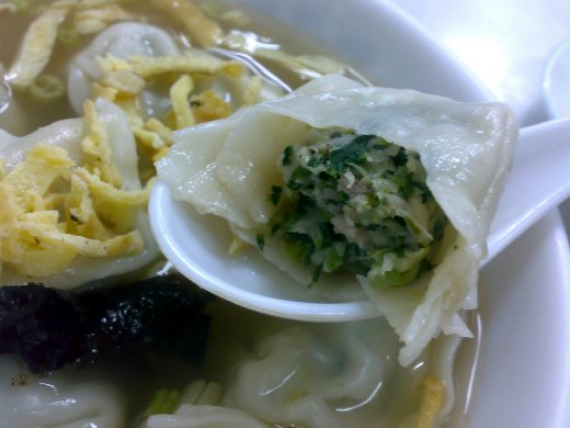晚上本來想吃牛肉麵的,阿德說那去桃園街吃好了,剛好在這附近,邊走邊問說我有沒有帶你去吃過呀,沒有吧!語氣很不肯定的我回答,其實有些路痴的我一定要到了才會知道我有沒有來過,一走到店門口我就知道原來我去過了,不過那家牛肉麵普普,而且不算便宜有破百吧!當場就決定吃別的好了,剛好沒隔兩間店就有在賣菜肉餛飩,而且人還挺多的,踩到地雷的機會應該比較小,入坐後等了一會餛飩就上來了,小碗有八顆餛飩,中碗則有十顆,價錢分別是 75 及95,其實有點忘了正確的價錢了,重點是餛飩超大顆的,照片上咬了一半的餛飩還跟湯匙一樣大,餛飩放在湯匙上都有點不穩,要用筷子幫忙,餡是雪菜加上豬肉,所以口感脆脆的,湯則是有放蛋絲跟菜圃及一點點乾海帶,不過真的是太大了,我直到吃完第五個才敢喝口湯,這一定是吃不完的啦,吃到第七個就撐了,浪費就浪費囉,沒法,誰叫老闆沒事弄那麼大個餛飩,大就是這兒的賣點囉!