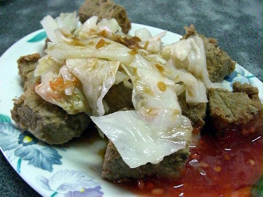 賣臭豆腐賣到要抽號碼牌,屌了吧!居然在牆上還有燈號顯示目前點餐的號碼,搞的像在醫院等看病一樣,不過心境差很多啦!牆上還有介紹這的豆腐是先用青草茶醃過,水也是宜蘭的好水,總之就是以健康為導向啦!臭豆腐跟北部的不太一樣,比較軟嫩,切面不是豆腐的白色,是有點綠綠的色澤,挺特別的,不過泡菜跟臭豆腐是哥倆好,我是覺得有點不夠吃啦!