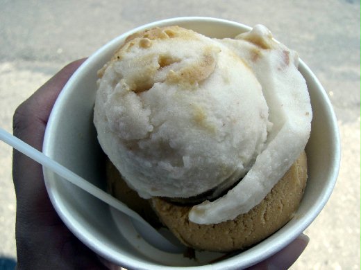 大熱天的吃完熱呼呼的臭豆腐後,當然想吃冰囉!店家也算利害,既然豆腐的生意好的亂七八遭的,綿綿冰自然生意也好到不行,一碗三球 25 元,可選兩種口味,有檸檬、花豆、花生、綠豆、紅豆、芋頭、酸梅、牛奶等等的口味,其中我最愛檸檬、花豆、花生這三種,檸檬其實是清冰再加上檸檬水,這很不一樣哦!一邊嗑冰一幫看老闆挖冰,生意好到沒時間擦滿臉的汗,真想幫他服務一下,呵呵,其實是怕老闆的汗滴到冰裡面,加料啦!