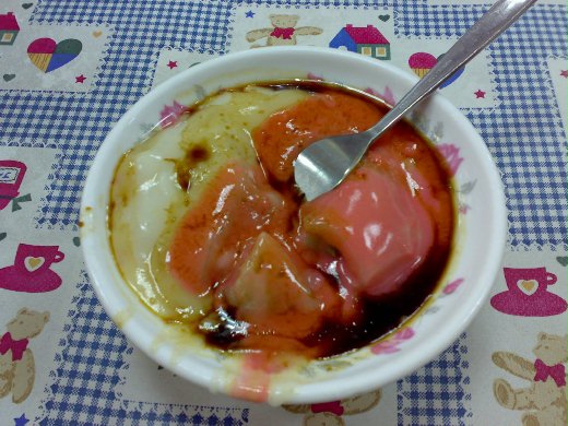 吃完了第一站,接著到附近的丁山肉丸吃肉圓,它有分辣跟不辣,差別在於多了紅色的醬汁,但在我吃起來沒啥辣味,所以當然也就再加上了甜辣醬,它是用蒸的方式並非是用低溫油去炸,所以不油膩,外皮Q,內餡也是豬絞肉但好像沒有加上常吃的荀絲吔,根據朋友介紹這也有賣餛飩湯,但沒有第二市場的餛飩湯來的好吃,所以只有吃了一碗肉圓就殺去第三站了。