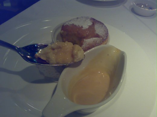 坐下來﹐服務生推著酒車過來﹐問我們要什麼酒。我問她有什麼樣的紅酒﹐意思是﹐她有 Melot, Cab, Pinot Noir etc. 和產地﹐是美國加州﹐是法國﹐還是澳洲。她一副很奇怪的樣子﹐紅酒就是紅酒啊﹐你怎麼問那麼多問題??? 她若是專職推酒車的﹐就實在應該多下點功夫認識酒。