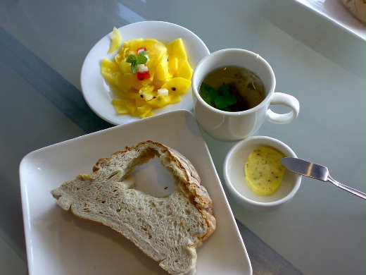用過了健康茶之後緊接著就上了麵包,它的蒜味奶油味道超好的,而且麵包邊邊烤的有點硬硬又熱呼呼的,塗上奶油一下就融化了,真的覺得好吃,開胃菜是百香果青木瓜,這道是我猜的啦,口感跟木瓜很像,醃的很入味,拿來當開胃菜真的很適合,不知是不是用餐環境的關係,連它的高麗菜我也覺的特別甜!接下來主餐就上來了,最好吃的首推黑胡椒香酥炸牛扒,份量剛剛好,牛扒很嫩黑胡椒也不會太喧賓奪主,比較沒銷的是客家媽媽筍絲焢肉,總覺的油太多了,肉有點肥,不過我老娘倒是很捧場,反到唸我說這道菜就要有點肥的肉才好吃。