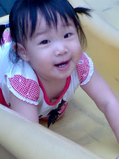 今天蘋蘋自己發現可以"倒蔥栽"。她將屁屁翹的老高,將頭頂在地上,世界瞬間就顛倒了。她很滿意這樣的變化吧!整個晚上就不停地這樣翻轉世界。一下是在地板,一下子又爬到沙發上,高高低低不停的在移動。有時見她翹高高的屁屁還開心地搖來晃去,於是忍不住就拍拍她的屁股;或是順勢的將她翻滾,完成翻筋斗這高難度的動作。蘋蘋總是很驚奇的看著我,然後舉起小小短短的食指比"1",這表示她還要再一次。比"1"也是蘋蘋會的動作之一,除了表示再一次之外,她也懂得這也代表一歲、一個。蘋蘋還進一步的運用在嘴上,當她的食指放在嘴巴上時,我就知道她要吃東西了。這樣複雜的關聯蘋蘋已運用的很好,為娘的我除了替她拍手叫好外,也真是備感欣慰。