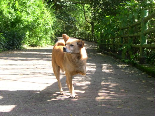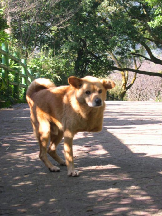 我開心的跳著、唱著,拿著相機胡亂拍著。慈濟人說:心美看什麼都美。好一句名言啊!當我好心情的時候,果真一切都很美。在我眼中,樹木雖只剩枯枝,但有藍天白雲的襯拖下,枯樹也變神木。相機一按,我就把樹木的神氣給拍下來。當這裡一棵神木,那裡一朵神花時,一隻狗兒飛奔經過。我沒理睬,繼續忙著拍神木、神花,想說等等有緣我們會在相見。沒一會,這些不會動的主角也拍完了,回過頭就看到一隻氣勢凌昂,頂天立地的小黃。對!就是剛剛那隻飛奔經過的狗兒。