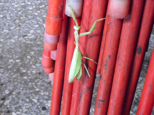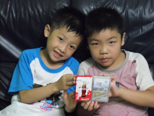 後記:相片中(撲克牌)就是他們的默契喔!普渡時的搶糖果的情景(秉翰眼巴巴的看著法座上的法師,看什麼時候還會灑下糖果和零錢,而秉燁則是開心的秀出他的戰利品)及我們在普渡時遇到的螳螂(牠也來參加普渡喔)。