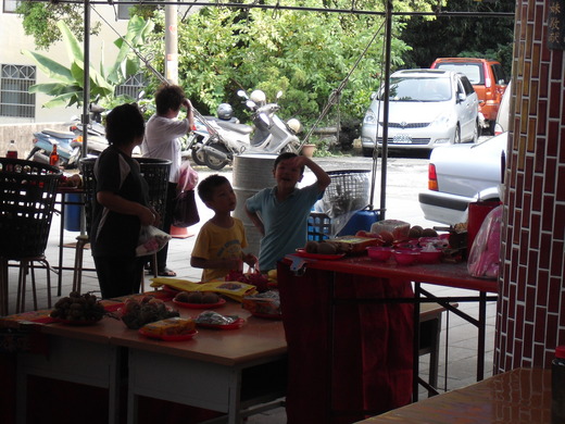 這一天家附近的觀音宮舉辦中元普渡法會,秉燁一開始就在那兒參加,這舉動讓我有點兒驚訝(因為燁一直不喜歡吵雜及熱的環境)但是,說實話我也挺開心的,他能夠融入當地如此傳統的節慶,而這個普渡法會更是我兒時的記憶,看到他與兆妍的模樣再加上翰也開心的參與,我和外子會心一笑。