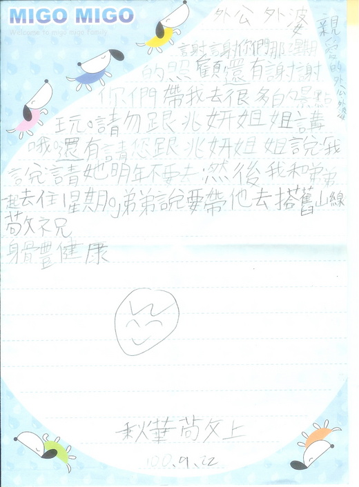 謝謝你們那兩星期的照顧,還有謝謝你們帶我去很多的景點玩。請勿跟兆姸姐姐講哦。還有請您跟兆妍姐姐說:「我說,請她明年不要去;然後我和弟弟一起去住一星期。」弟弟說要帶他去搭舊山線。