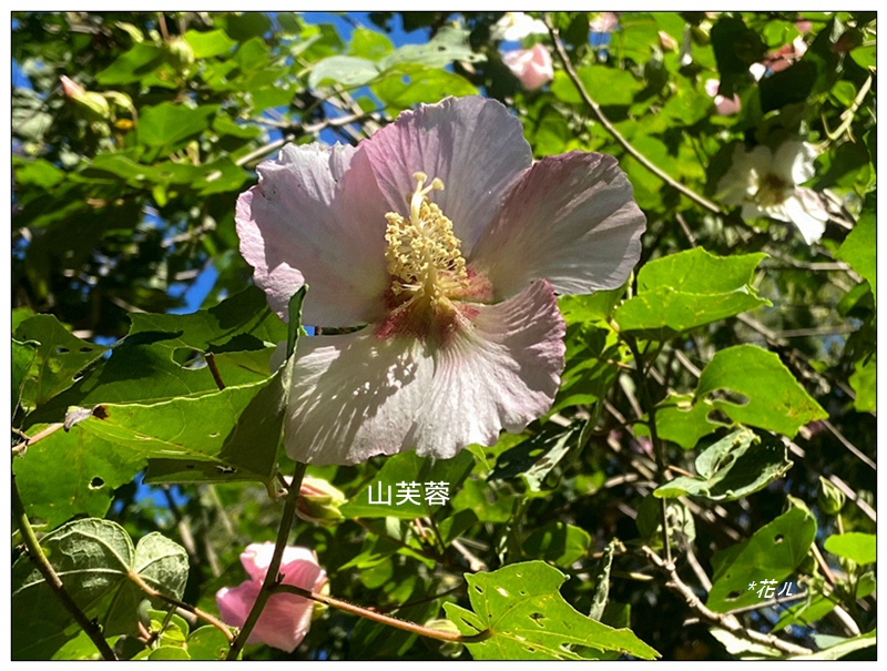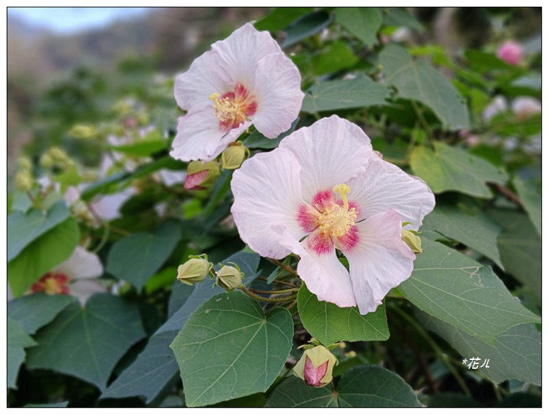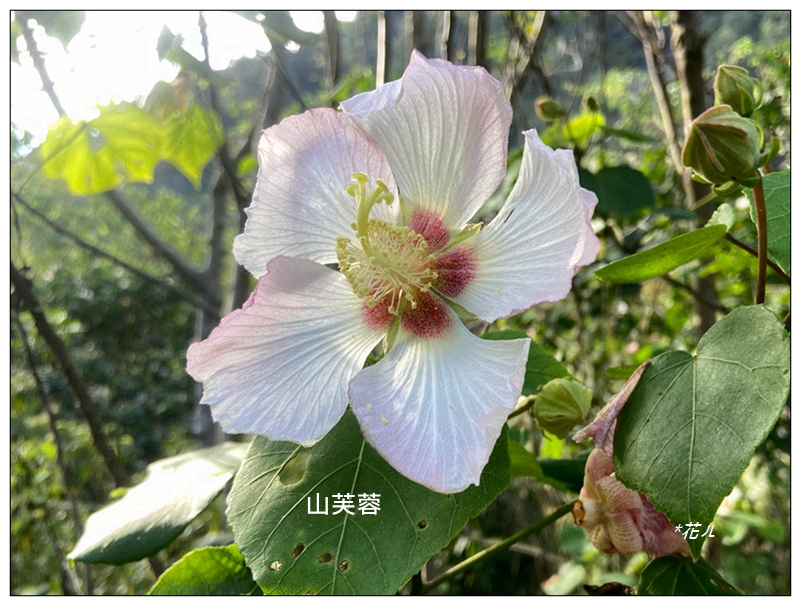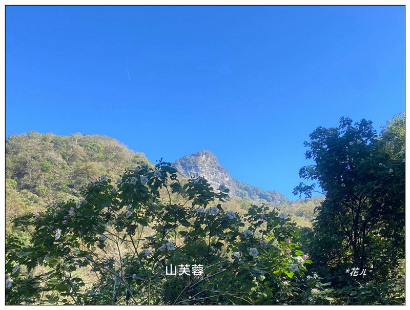吊橋上有視野,見一溪瀑及岸旁山芙蓉花開。