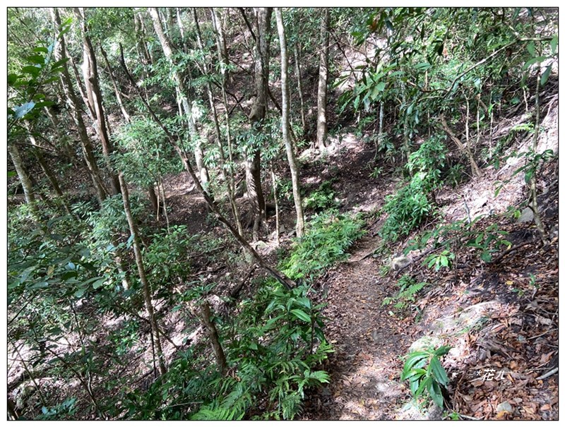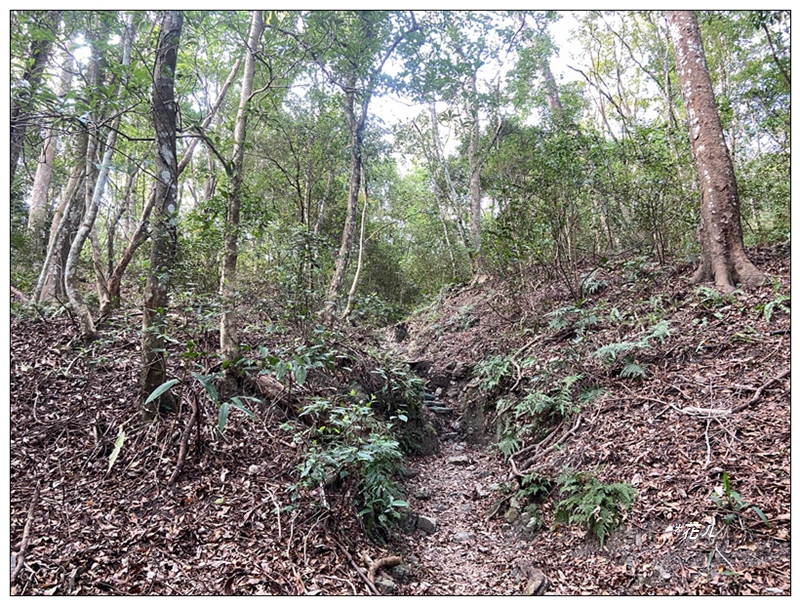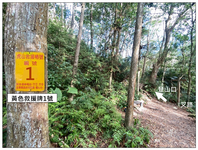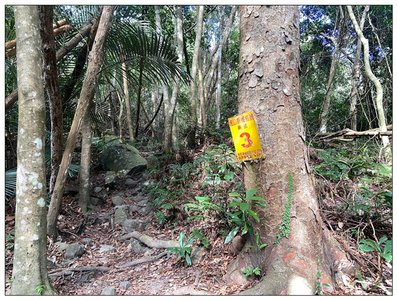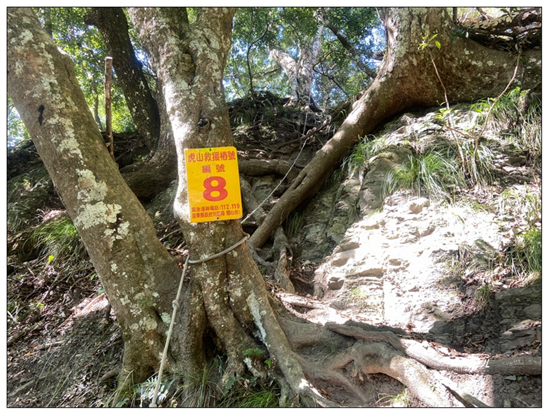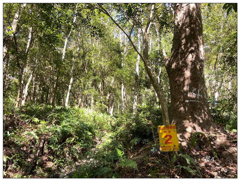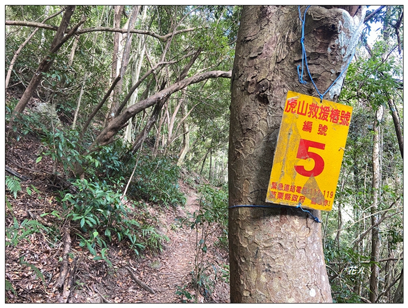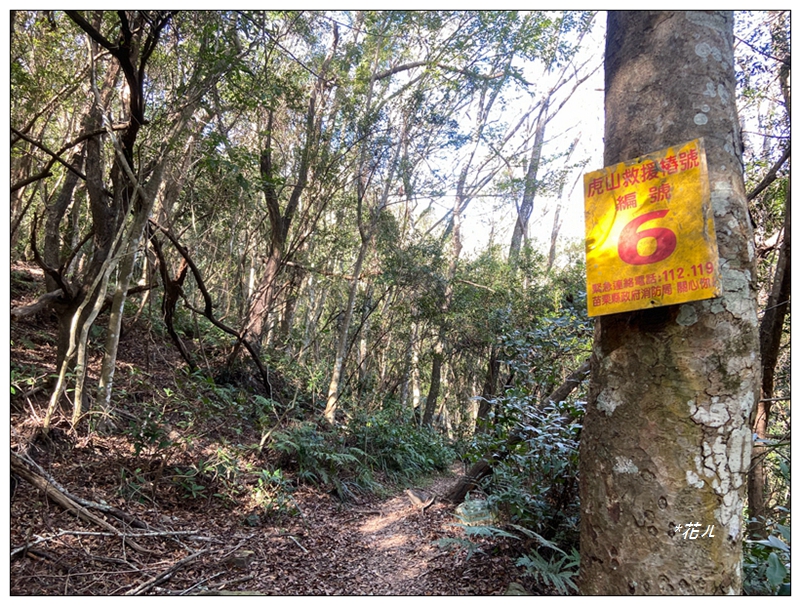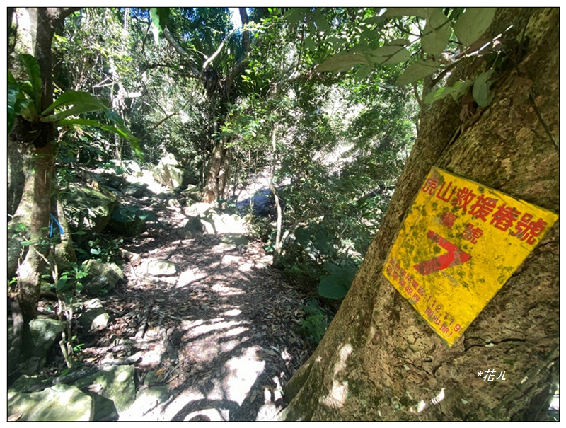 可見黃色救援牌從1~7號,無叉路腰遶至溪谷叉路,樹蔭蔽日緩上好走。