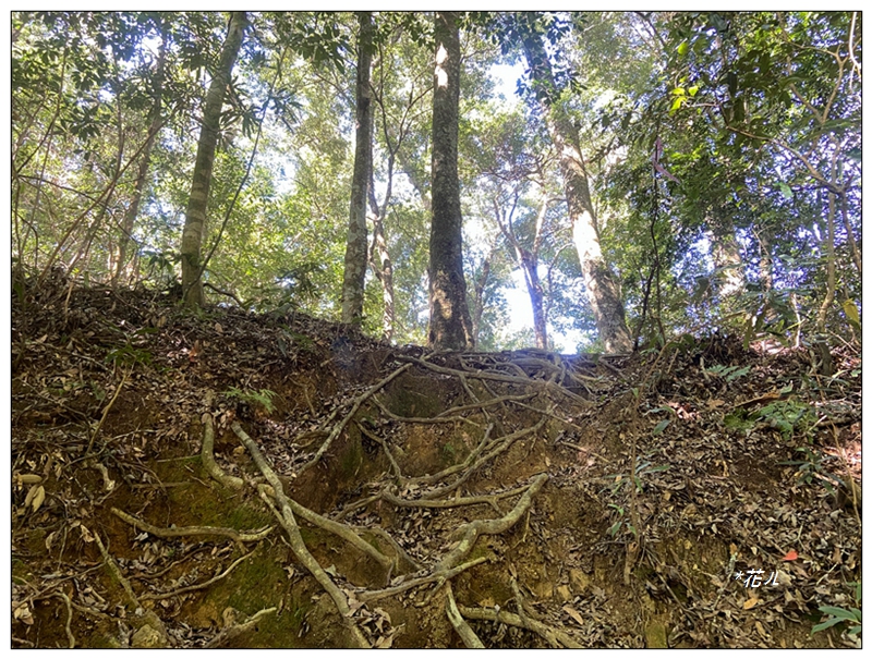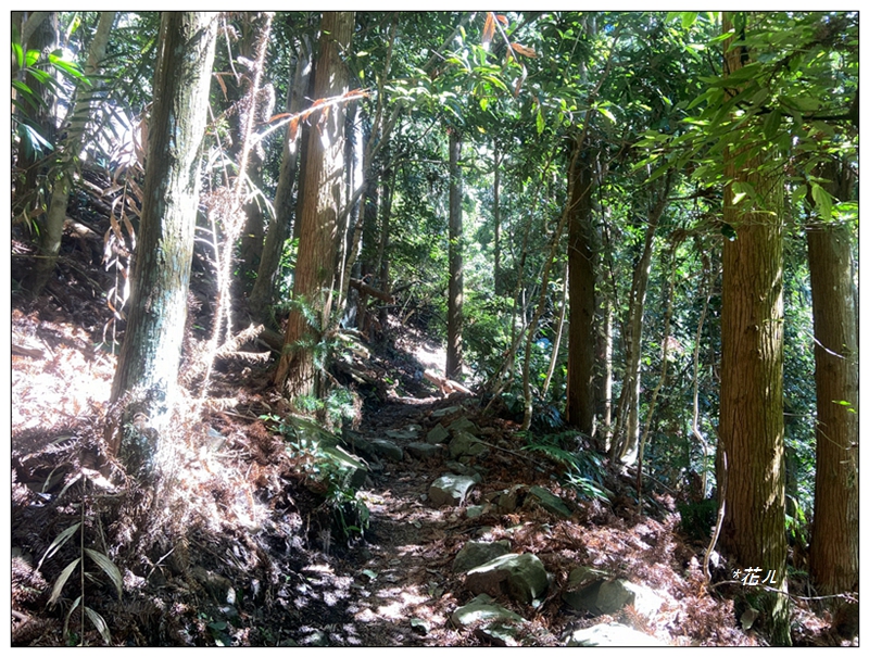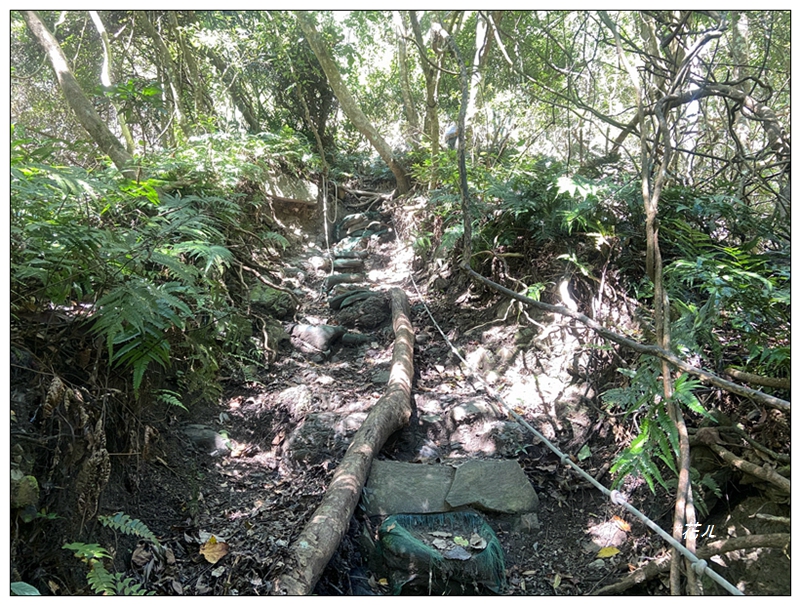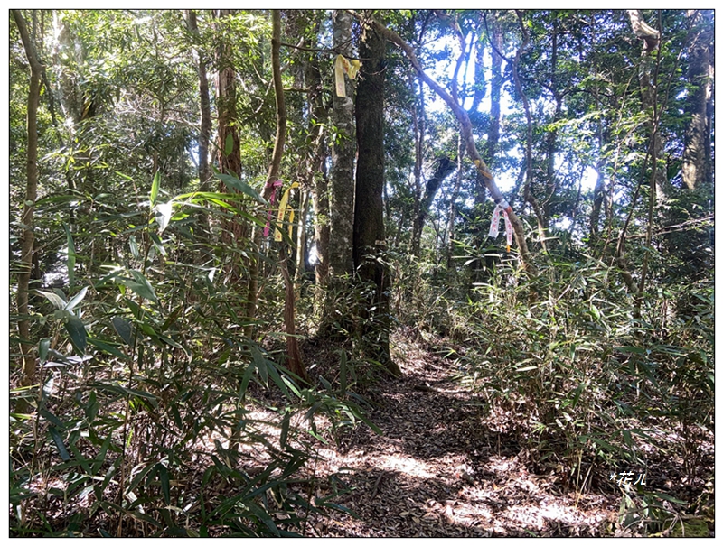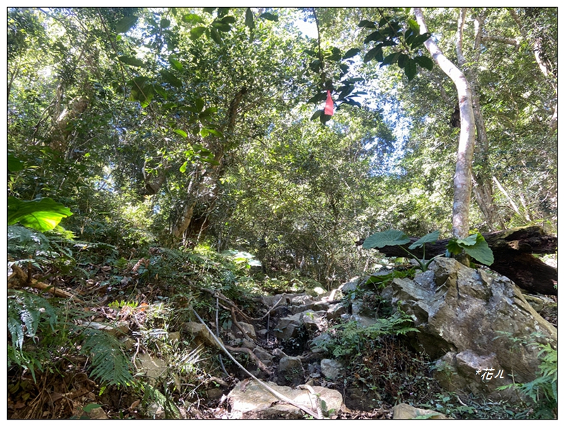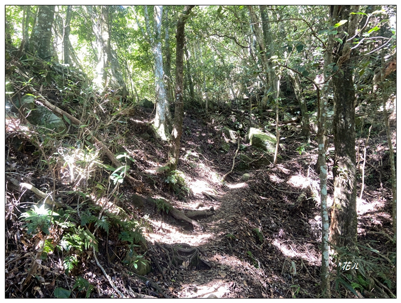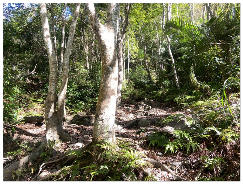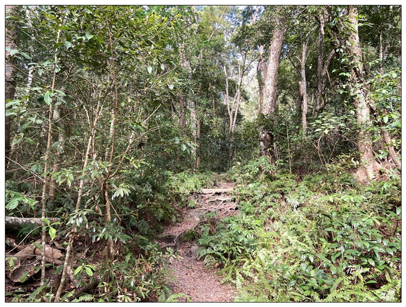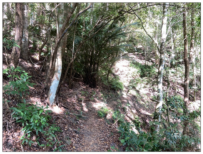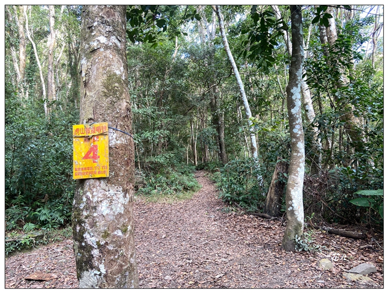 可見黃色救援牌從1~7號,無叉路腰遶至溪谷叉路,樹蔭蔽日緩上好走。