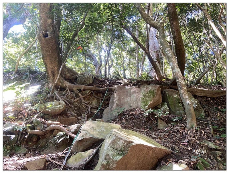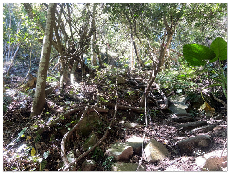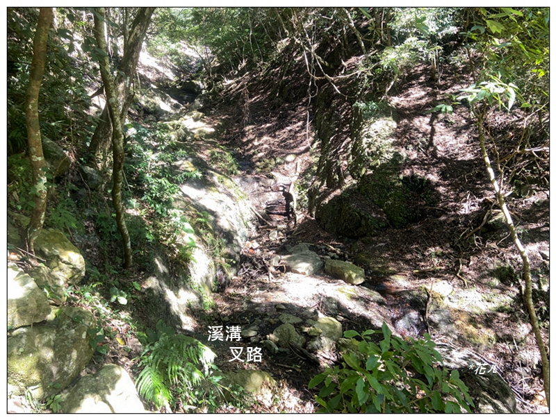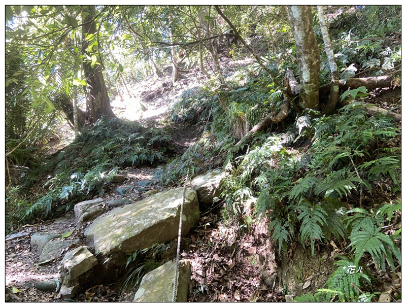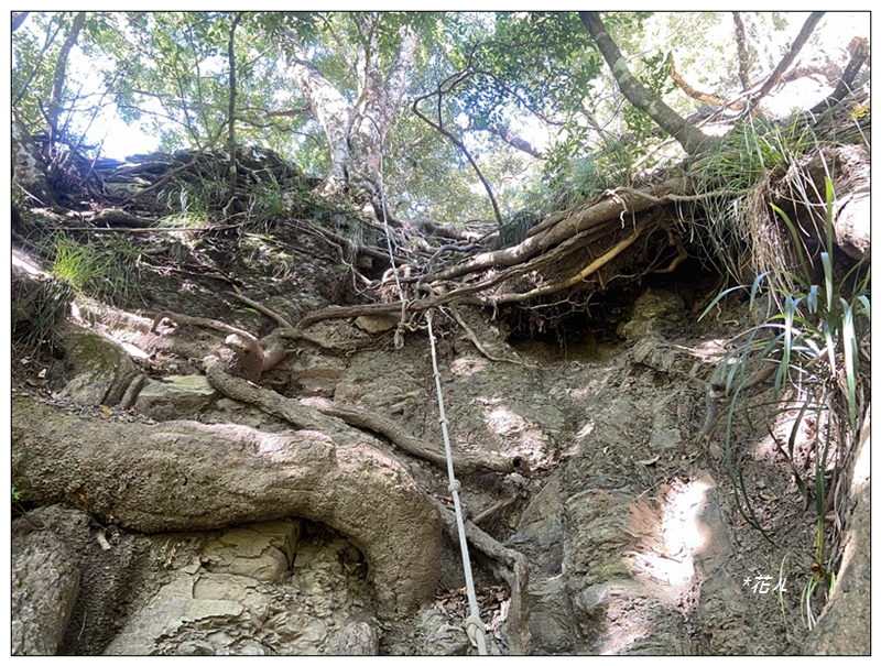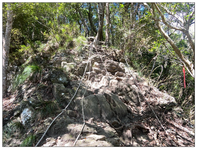 溪谷叉路取左陡上,沿碎石陡坡拉繩而上,
