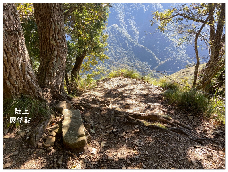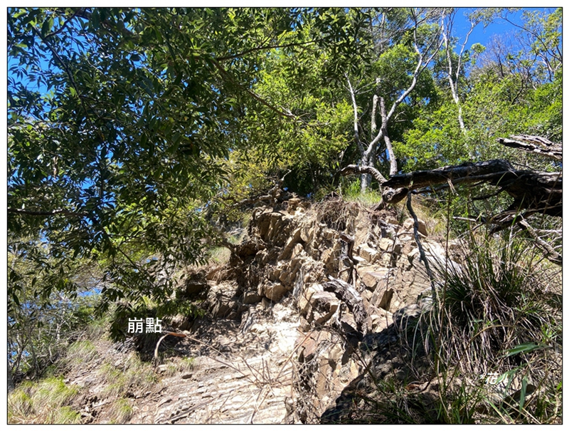過黃色救援8號牌後遇崩塌點,及一展望點有腹地供休憩。